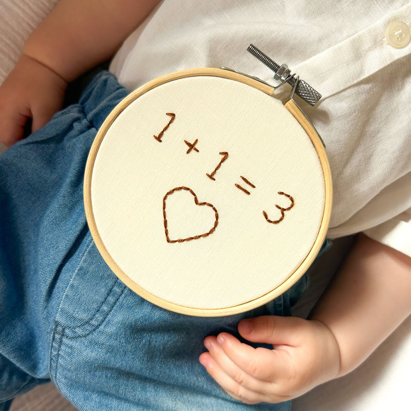 Διακοσμητικό τελάρο κεντήματος με κεντημένη τη μαθηματική πράξη: "1+1=3" . Ένα υπέροχο δώρο για το βρεφικό / παιδικό δωμάτιο!