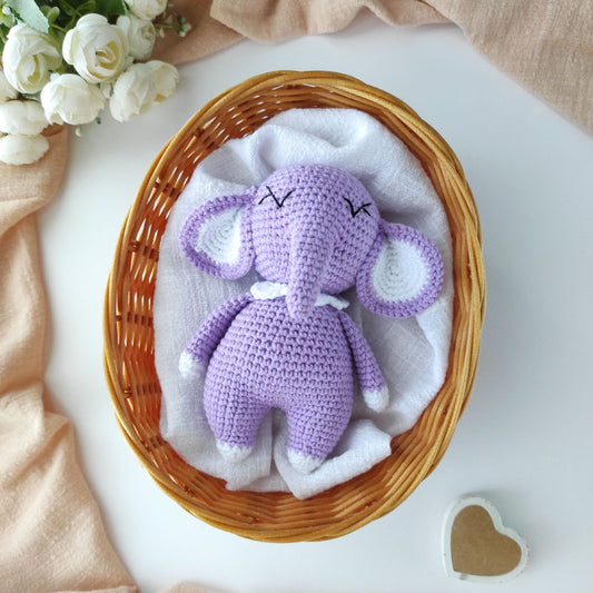 Σετ πλεκτό κουκλάκι λιλά ελέφαντας και κουδουνίστρα, ύψος 14/12εκ