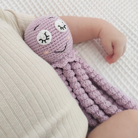 Σετ πλεκτό κουκλάκι λιλά χταπόδι και πλεκτά καλτσάκια με φτερά για νεογέννητο