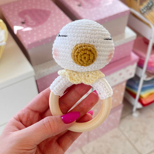 Σετ πλεκτό λευκό παπάκι με κουδουνίστρα και πλεκτά καλτσάκια σε ανοιχτό κίτρινο χρώμα, ύψος 16/13εκ