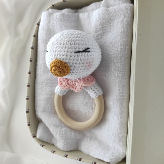 Σετ πλεκτό λευκό παπάκι με κουδουνίστρα και πλεκτά καλτσάκια σε ροζ χρώμα.