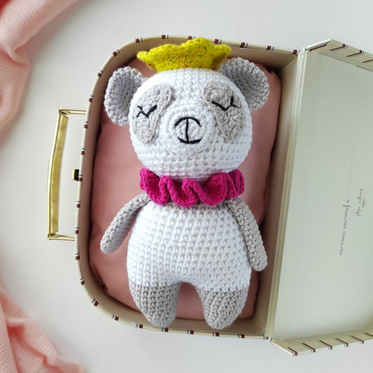 Σετ πλεκτό κουκλάκι λευκό panda και κουδουνίστρα με κορώνα και φούξια γιακά, ύψος 17/15εκ