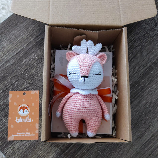 Σετ πλεκτό κουκλάκι ροζ ελάφι και κουδουνίστρα, ύψος 16/14εκ