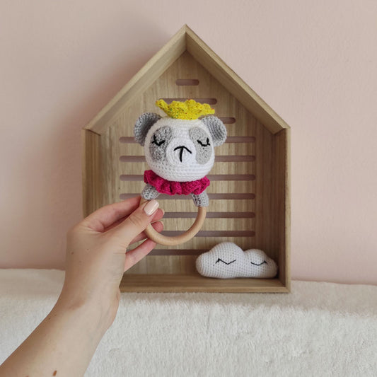 Πλεκτή κουδουνίστρα άσπρο-γκρι panda, ύψος 15εκ