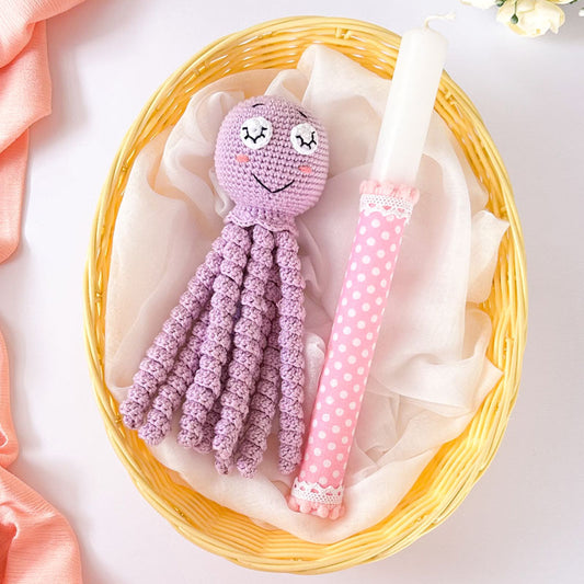 Πασχαλινή λευκή λαμπάδα με ροζ πουά ύφασμα και πλεκτό λιλά χταπόδι, ύψος 25εκ