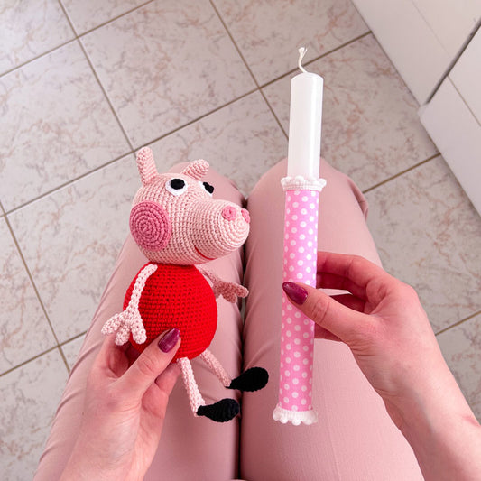 Πασχαλινή λευκή λαμπάδα με ροζ πουά ύφασμα και πλεκτό κουκλάκι Πέππα το Γουρουνάκι, ύψος 25εκ