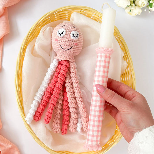 Πασχαλινή λευκή λαμπάδα με ροζ καρό ύφασμα και πλεκτό ροζ χταπόδι, ύψος 25εκ