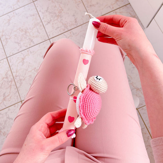 Πασχαλινή λευκή λαμπάδα με ροζ ύφασμα καρδιές και πλεκτό ροζ χελωνάκι μπρελόκ, ύψος 25εκ