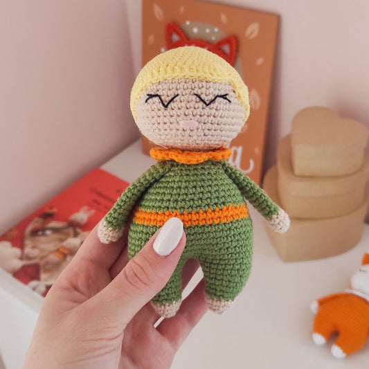Πλεκτή κουδουνίστρα αγοράκι με καφέ μαλλιά, ύψος 12εκ