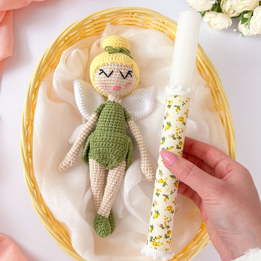 Πασχαλινή λευκή λαμπάδα με φλοράλ ύφασμα και πλεκτή κούκλα Τίνκερμπελ, ύψος 25εκ