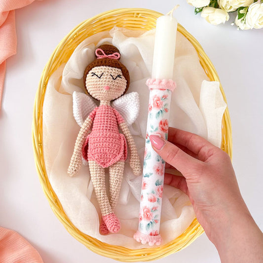 Πασχαλινή λευκή λαμπάδα με ροζ φλοράλ ύφασμα και πλεκτή νεράιδα με ροζ φόρεμα, ύψος 25εκ