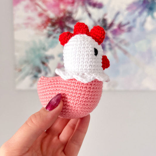 Πασχαλινή λευκή λαμπάδα με ροζ καρό ύφασμα και πλεκτή ροζ κοτούλα, ύψος 25εκ