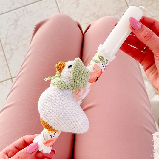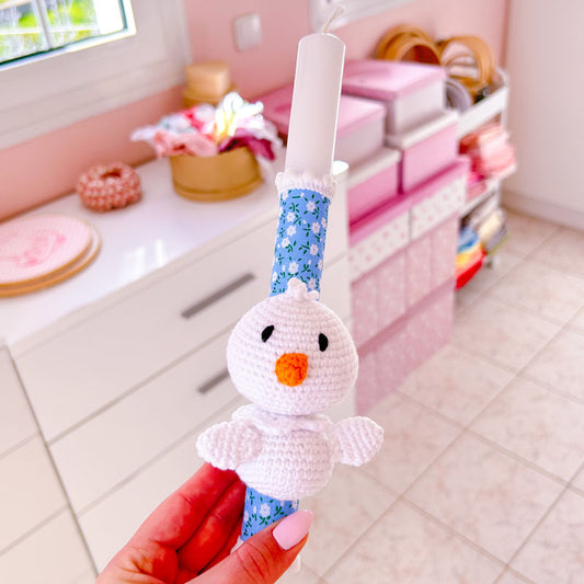 Πασχαλινή λευκή λαμπάδα με φλοράλ ύφασμα και πλεκτή λευκή χήνα με καπέλο, ύψος 25εκ