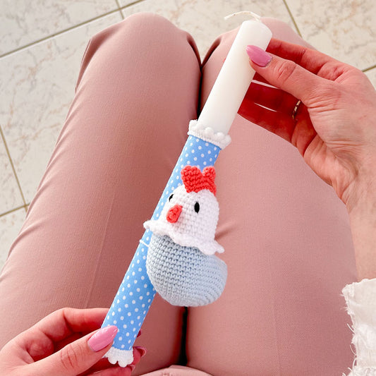 Πασχαλινή λευκή λαμπάδα με μπλε πουά ύφασμα και πλεκτή γαλάζια κοτούλα, ύψος 25εκ