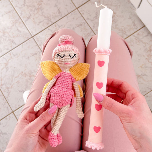 Πασχαλινή λευκή λαμπάδα με ροζ ύφασμα καρδιές και πλεκτή νεράιδα με ροζ φόρεμα, ύψος 25εκ