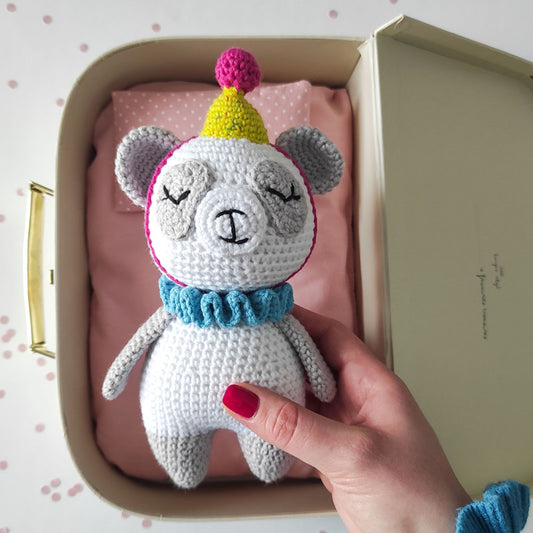 Πλεκτό κουκλάκι λευκό panda με γκρι λεπτομέρειες και κίτρινη κορώνα, ύψος 17εκ