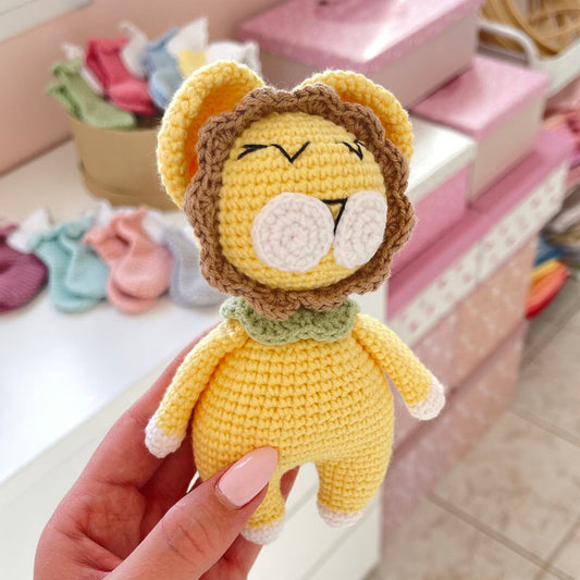 Πλεκτό κουκλάκι κίτρινο λιοντάρι με πράσινο γιακά, ύψος 16εκ
