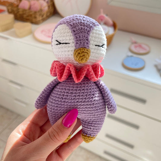 Πλεκτό κουκλάκι λιλά πιγκουίνος με φούξια γιακά, ύψος 14εκ