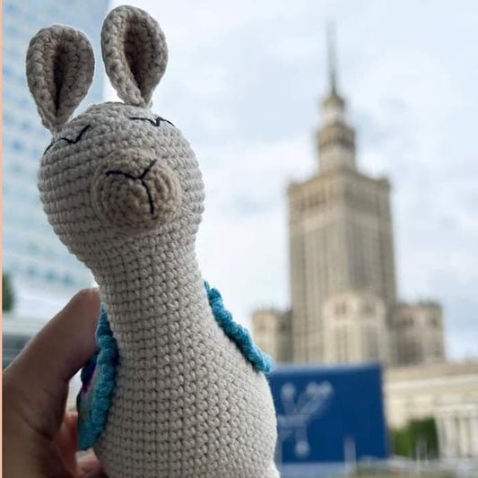 Πλεκτό κουκλάκι μπεζ αλπακά (llama) με πολύχρωμη σέλα, ύψος 19εκ
