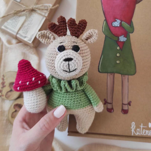 Πλεκτό κουκλάκι μπεζ ελάφι με πράσινη μπλούζα και πλεκτό μανιτάρι, ύψος 16εκ