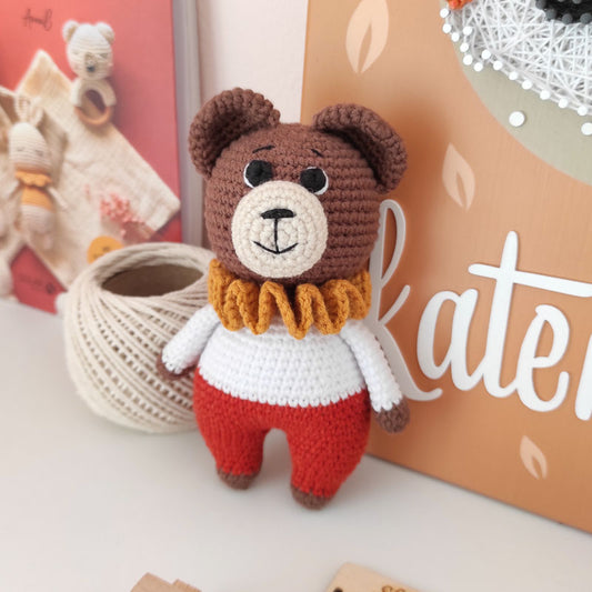 Πλεκτό κουκλάκι καφέ αρκουδάκι με λευκή μπλούζα και πορτοκαλί παντελόνι, ύψος 15εκ