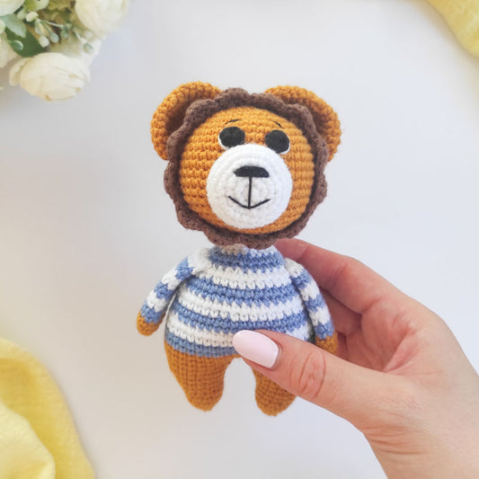 Πλεκτό κουκλάκι μουσταρδί λιοντάρι με ριγέ μπλε μπλούζα, ύψος 16εκ