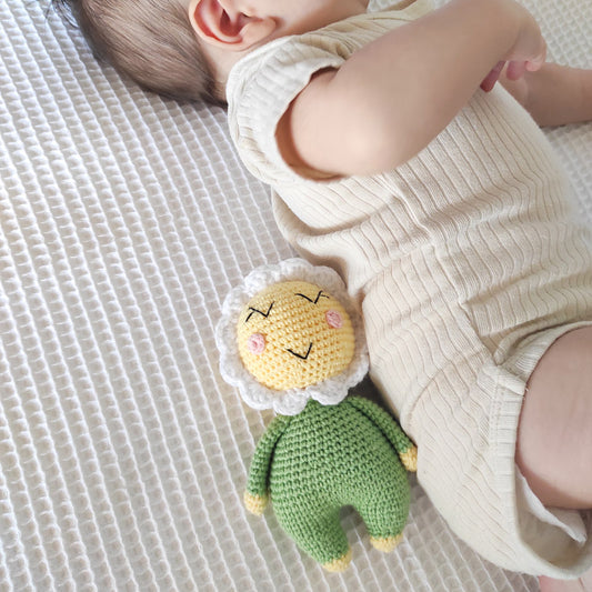Πλεκτό κουκλάκι λουλούδι χαμομήλι με κίτρινο πρόσωπο και λευκά πέταλα, ύψος 15εκ