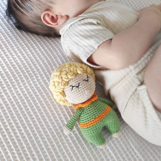 Πλεκτό κουκλάκι Μικρός Πρίγκιπας με πράσινα ρούχα και ξανθές πλεκτές μπούκλες, ύψος 16εκ