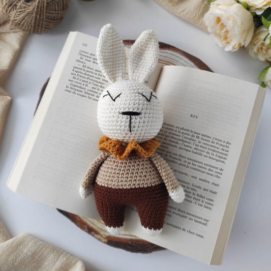 Πλεκτό κουκλάκι εκρού λαγουδάκι με καφέ παντελόνι και μουσταρδί γιακά, ύψος 19εκ