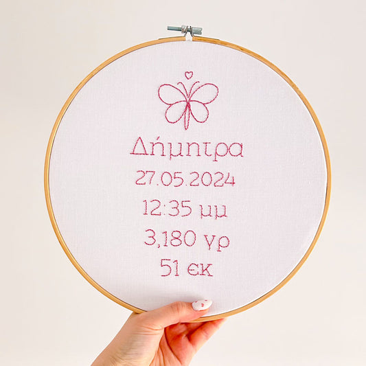 Προσωποποιημένο διακοσμητικό τελάρο κεντήματος με τα στοιχεία γέννησης του μωρού για κοριτσάκι, διάμετρος 26εκ