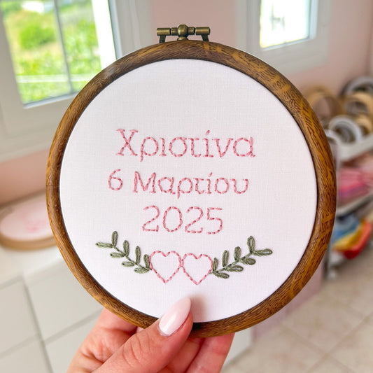 Προσωποποιημένο διακοσμητικό τελάρο κεντήματος με τα στοιχεία γέννησης του μωρού, διάμετρος 20εκ