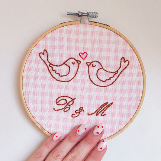 Προσωποποιημένο διακοσμητικό τελάρο κεντήματος με θέμα "Love Birds" με κεντημένα τα αρχικά του ζευγαριού, διάμετρος 16εκ