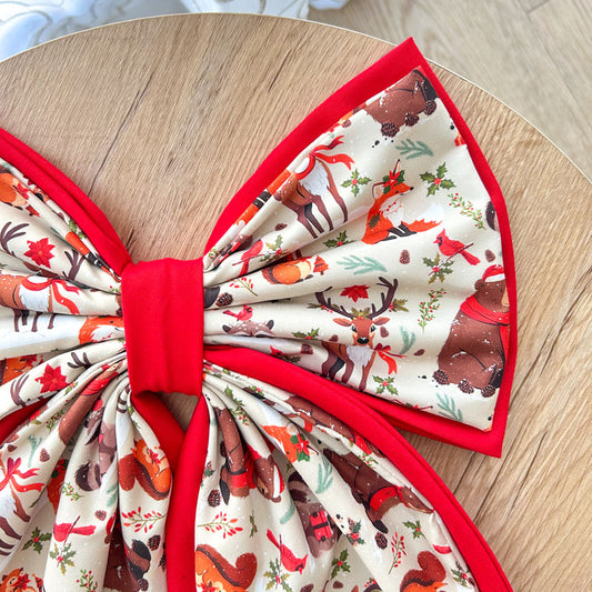 Διπλός Κόκκινος Φιόγκος - Ζωάκια σε Χριστουγεννιάτικη Παράσταση - Διακοσμητικός Χειροποίητος Υφασμάτινος Φιόγκος - Ύψος 47εκ Μήκος 30εκ