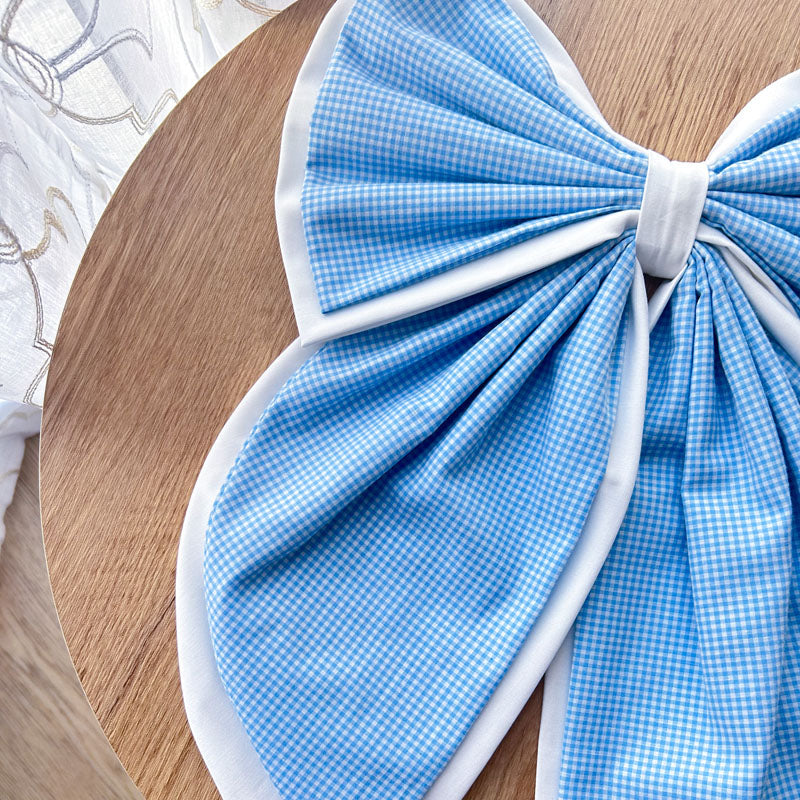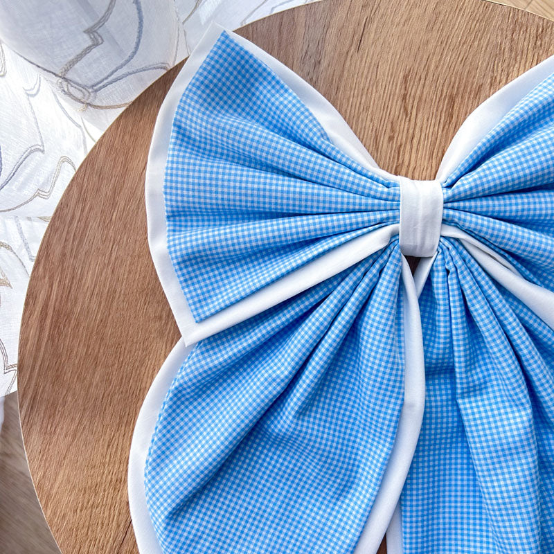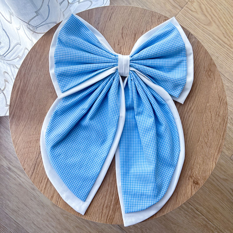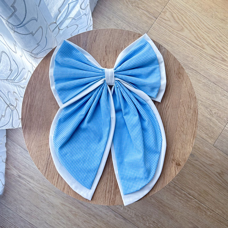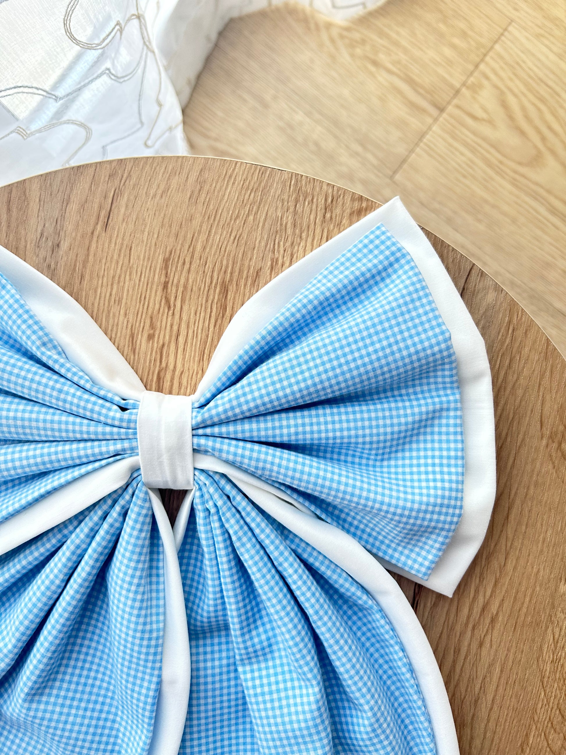 💙 Υφασμάτινος διπλός φιόγκος σε χρώμα λευκό και μπλε καρό. Το ύψος του είναι 47 εκατοστά και το μήκος του στο πιο φαρδύ σημείο είναι 30 εκατοστά. Έρχεται σε εσάς με περασμένη κορδέλα στο πάνω μέρος σαν θηλιά για να τον κρεμάσετε απευθείας!