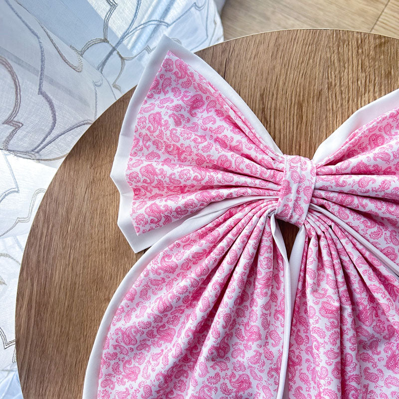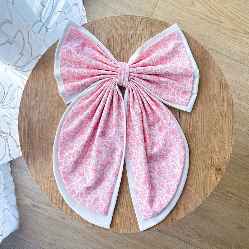 🩷 Υφασμάτινος διπλός φιόγκος σε χρώμα λευκό και ροζ λαχούρι. Το ύψος του είναι 47 εκατοστά και το μήκος του στο πιο φαρδύ σημείο είναι 30 εκατοστά. Έρχεται σε εσάς με περασμένη κορδέλα στο πάνω μέρος σαν θηλιά για να τον κρεμάσετε απευθείας!