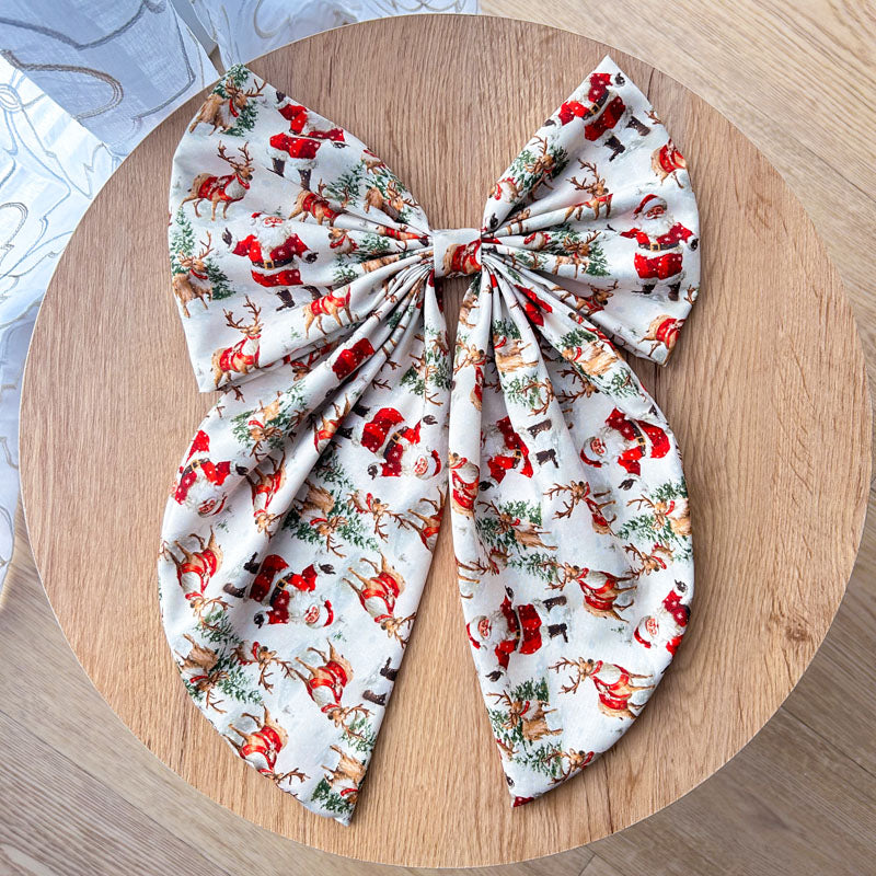 ❤️ Υφασμάτινος μπεζ μονός φιόγκος με χριστουγεννιάτικα σχέδια (επαναλαμβανόμενα μοτίβα με τον Άγιο Βασίλη και τον τάρανδο Ρούντολφ). Το ύψος του είναι 45 εκατοστά και το μήκος του στο πιο φαρδύ σημείο είναι 30 εκατοστά. Έρχεται σε εσάς με περασμένη κορδέλα στο πάνω μέρος σαν θηλιά για να τον κρεμάσετε απευθείας!