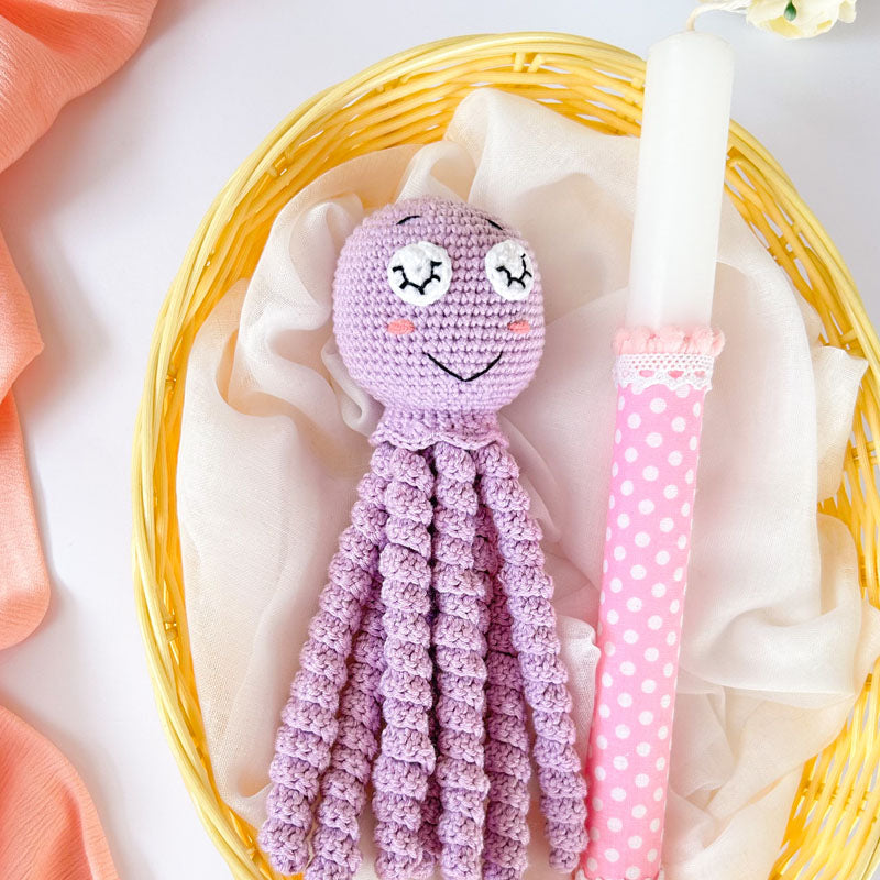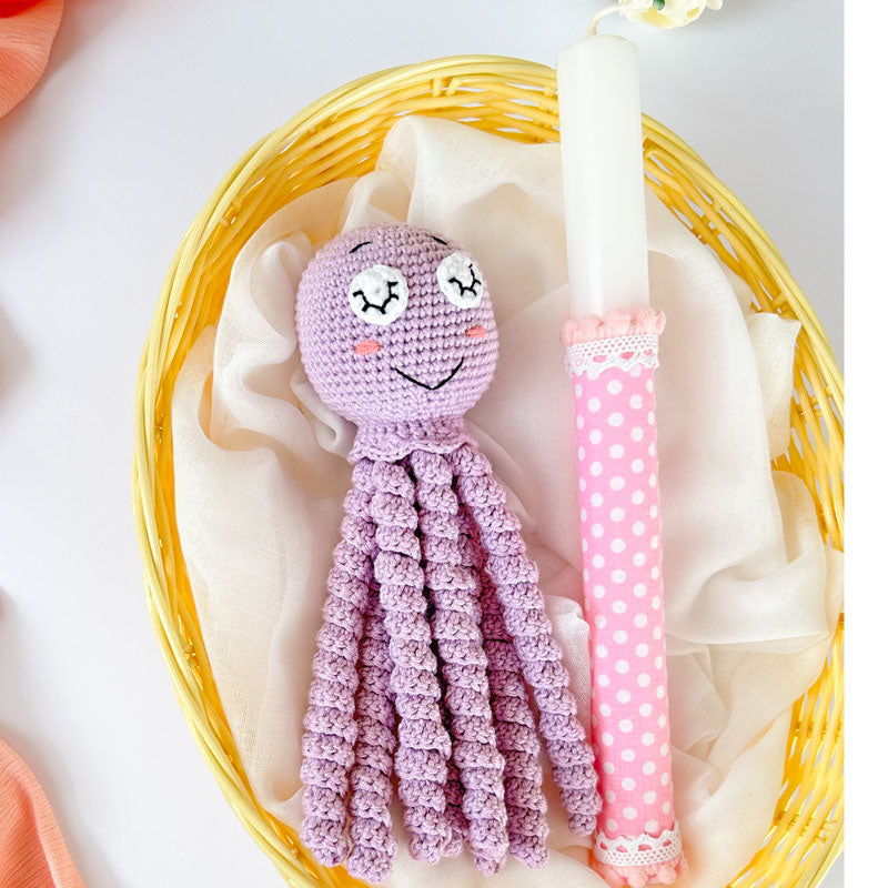 Λευκή λαμπάδα με ροζ πουά ύφασμα και ροζ πομ πομ. Το ύψος της λαμπάδας είναι 25 εκατοστά. Συνοδεύεται από πλεκτό κουκλάκι, λιλά χταπόδι με λιλά πλοκάμια. Τα χαρακτηριστικά του προσώπου του είναι πλεκτά και κεντητά.
