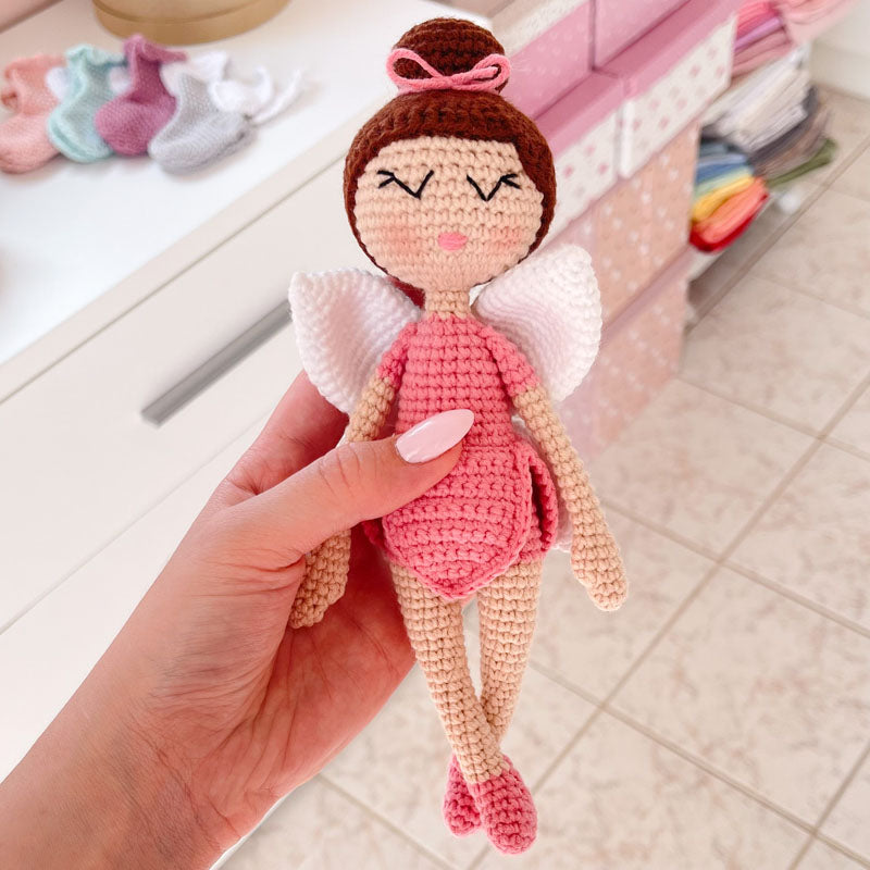 Πλεκτή κούκλα νεράιδα με φούξια φόρεμα, λευκά φτερά και καφέ μαλλιά.