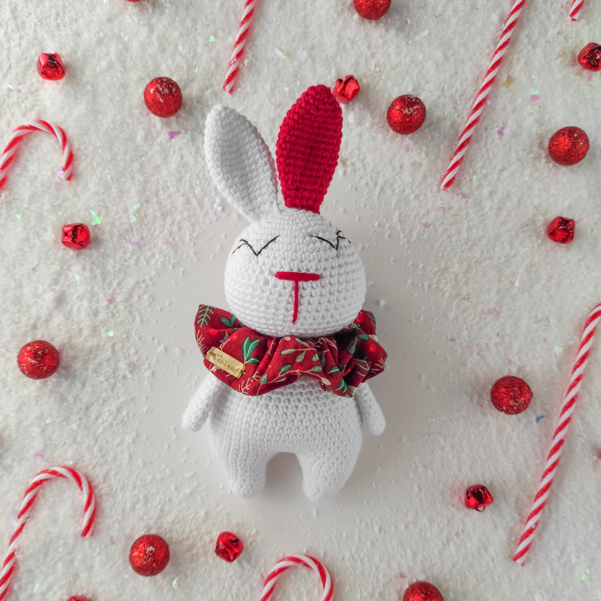 🐰Πλεκτό Λούτρινο Λαγουδάκι – Ένα απαλό amigurumi λαγουδάκι σε λευκό χρώμα, με κόκκινο αυτί και κόκκινο scrunchy με πολύχρωμο χριστουγεννιάτικο μοτίβο!