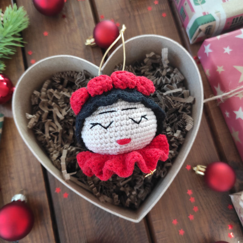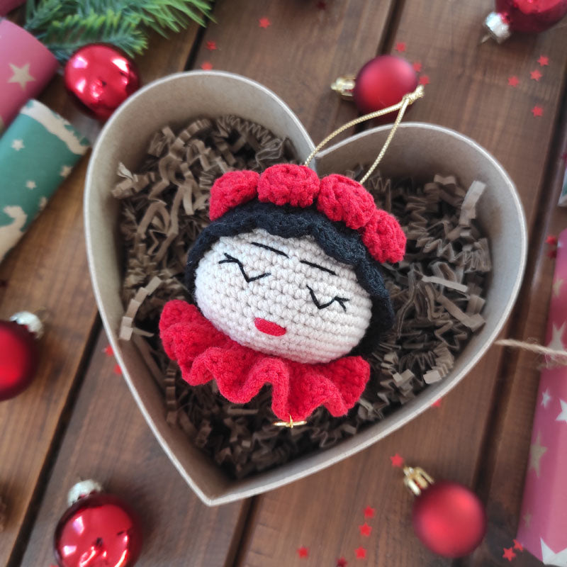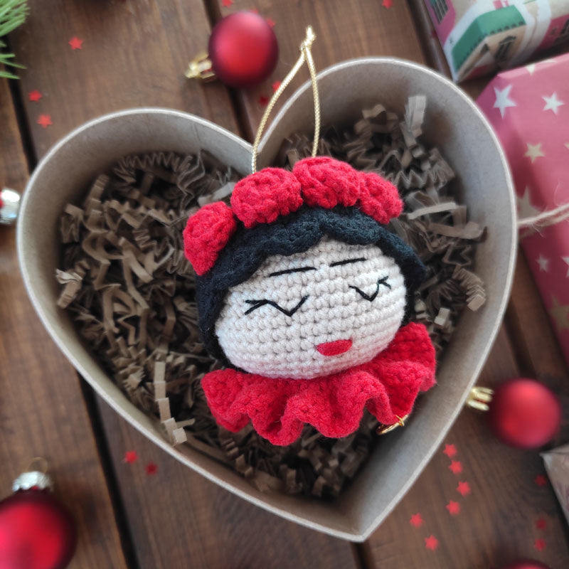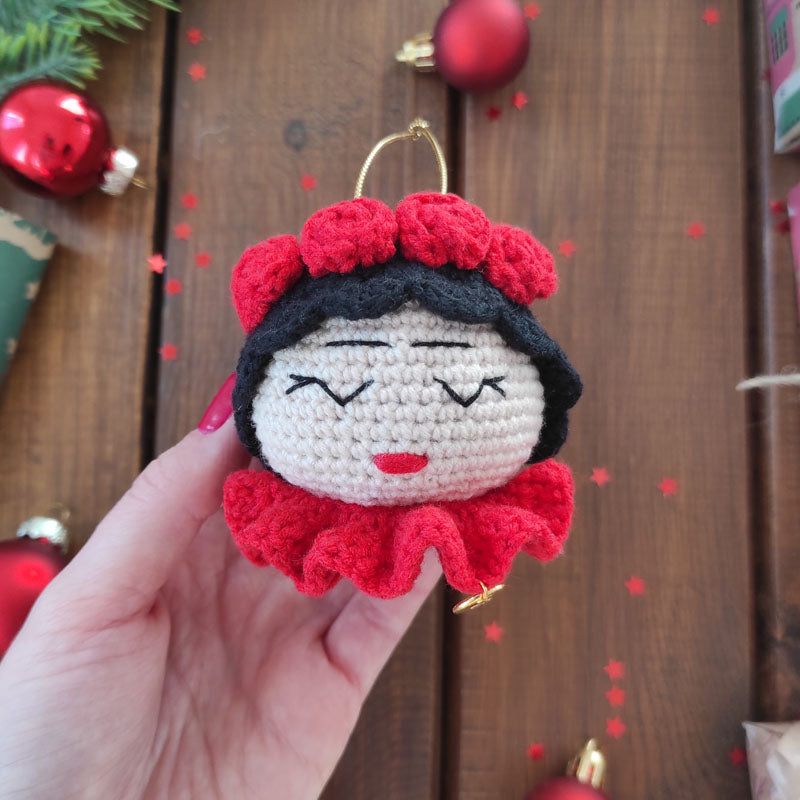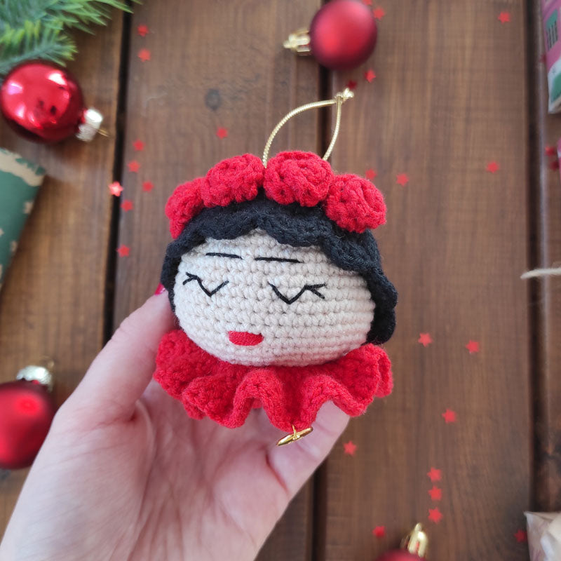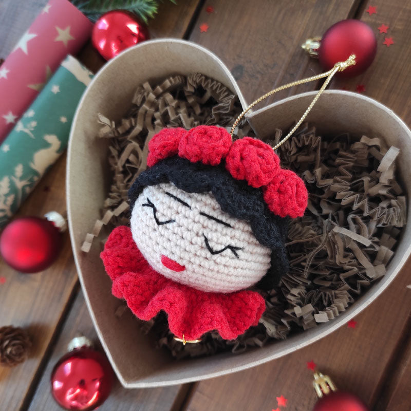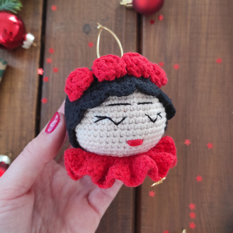 🧸 Στολίδι Φρίντα Amigurumi (ύψος 11εκ., χωρίς το ύψος του χρυσού κορδονιού)
