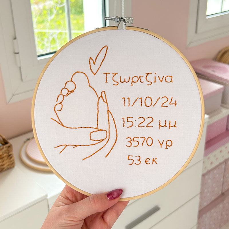 Προσωποποιημένο διακοσμητικό τελάρο κεντήματος με κεντημένο το όνομα του παιδιού, την ημερομηνία και την ώρα γέννησης, το ύψος και τα κιλά του και ως κεντρικό σχέδιο το χέρι της μαμάς που αγκαλιάζει το ποδαράκι του μωρού. Ένα υπέροχο δώρο για το βρεφικό / παιδικό δωμάτιο!