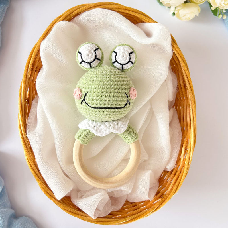 1.Πλεκτή κουδουνίστρα βάτραχος σε ανοιχτό πράσινο (βεραμάν) χρώμα, ύψους 14 εκατοστών. Περιέχει κουδουνάκι στο εσωτερικό της. Τα χαρακτηριστικά του προσώπου του είναι πλεκτά και κεντητά.