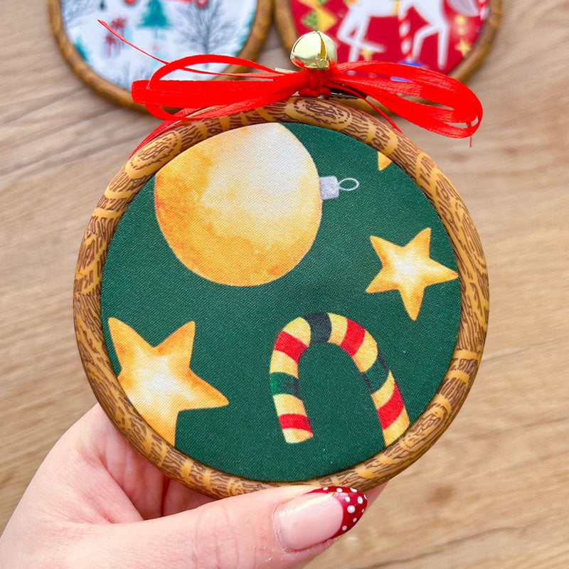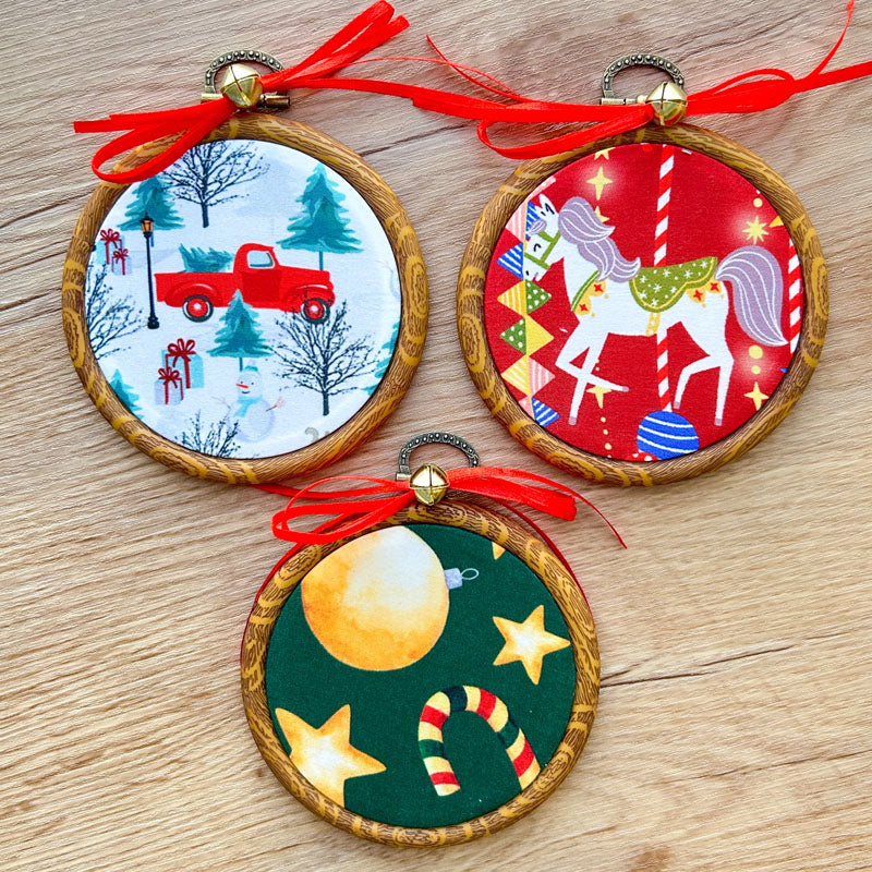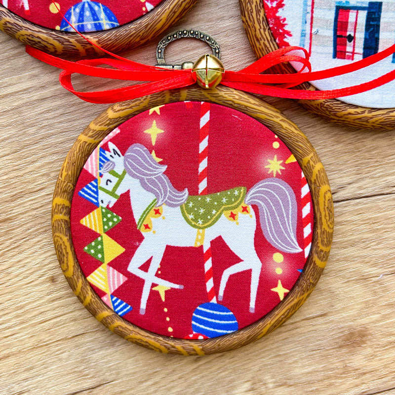 Χριστουγεννιάτικα Στολίδια σε Τελάρο Κεντήματος - 3 Τεμάχια - Αλογάκι Καρουζέλ, Κόκκινο Αυτοκίνητο και Στολίδια